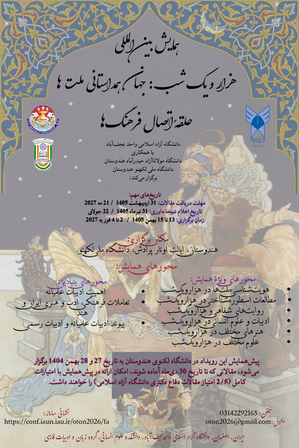 پیش همایش این رویداد در دانشگاه لکهنوی هندوستان به تاریخ 27 و 28 بهمن 1404 برگزار میشود، مقالاتی که تا تاریخ 30 دیماه آماده شوند، امکان ارائه در پیشهمایش با امتیازات کامل (2.5 امتیاز مقالات دفاع دکتری دانشگاه آزاد اسلامی) را خواهند داشت.